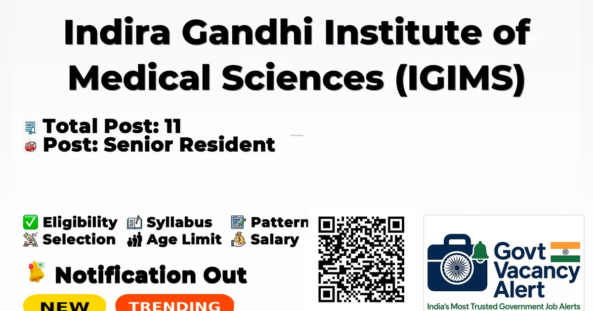 Indira Gandhi Institute of Medical Sciences (IGIMS) Recruitment 2025 for 11 posts of Senior Resident. Candidates with MS/MD Can attend the walkin. The Walk-in on 06-01-2026. For detailed information please visit IGIMS official website, igims.org.