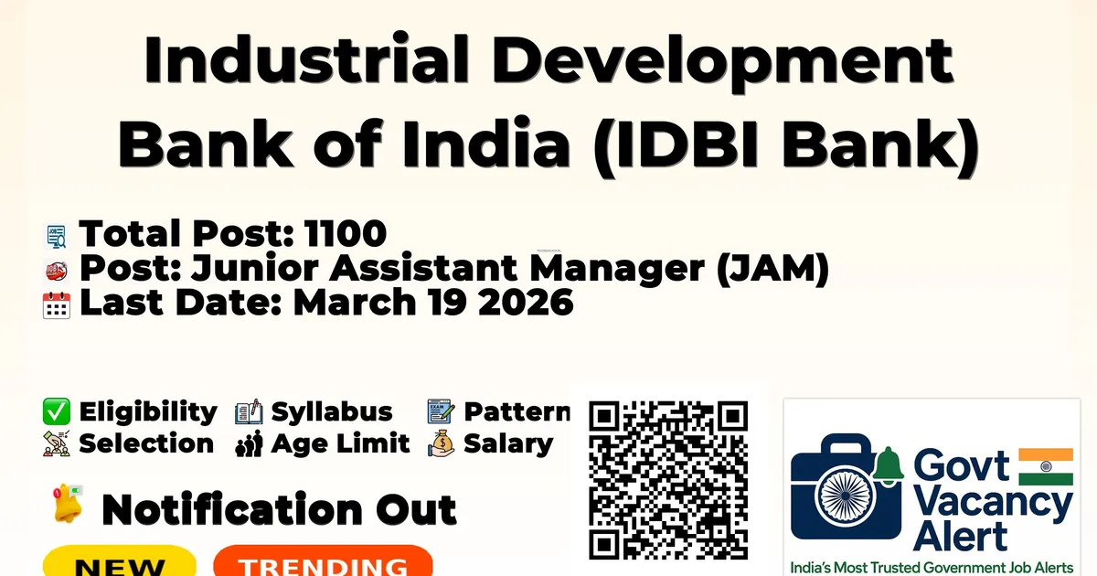 Company Name Industrial Development Bank of India (IDBI Bank) Post Name Junior Assistant Manager (JAM) No of Posts 1100 Advt No 6 & 7/2025-26 Qualification Any Bachelors Degree Age Limit 20 to 25 years Start Date for Apply Online March 08 2026 Last Date for Apply Online March 19 2026 Official Website https://www.idbi.bank.in/