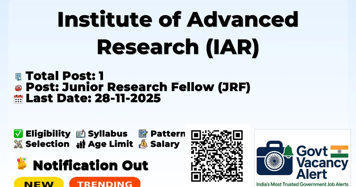 Institute of Advanced Research (IAR) has released an official notification for the recruitment of 01 Junior Research Fellow Posts. Interested and eligible candidates can apply Online through the official IAR website. The last date to submit the application form is 28-11-2025. In this article, you’ll find the IAR Junior Research Fellow Posts recruitment details, including eligibility criteria, age limit, salary structure, selection process, application steps, and direct links to the official notification and Online application form.
