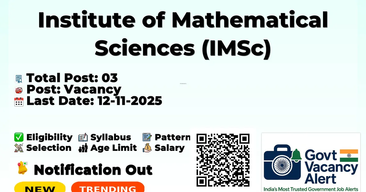 Institute of Mathematical Sciences (IMSc) has released an official notification for the recruitment of 03 Project Assistant, Research Assistant Posts. Interested and eligible candidates can apply Online through the official IMSc website. The last date to submit the application form is 12-11-2025. In this article, you’ll find the IMSc Project Assistant, Research Assistant Posts recruitment details, including eligibility criteria, age limit, salary structure, selection process, application steps, and direct links to the official notification and Online application form. Join Our Arattai Channel: Join Here Advertisement Company Name Institute of Mathematical Sciences (IMSc) Post Name Project Assistant, Research Assistant No of Posts 03 Pay Matrix Rs. 48000-75000 Qualification B.Tech/B.E, M.Sc, M.Phil/Ph.D Age Limit Candidates should be less than 40 years Start Date for Apply Online 28-10-2025 Last Date for Apply Online 12-11-2025 Official Website imsc.res.in Post Name Vacancy Research Assistant 01 Project Assistant (Computer Programmer) 01 Project Assistant 01 Candidates Should Posses B.Tech/B.E, M.Sc, M.Phil/Ph.D (Relevant Fileds) Maximum Age limit: Candidates should be less than 40 Years Age relaxation is applicable as per rules. Research Assistant: Rs. 54,500: For individuals who have submitted or defended their Ph.D. thesis. Rs. 75,000: For individuals who have obtained their Ph.D. degree. Project Assistant (Computer Programmer): Rs. 48000 Project Assistant: Rs. 48000 Starting Date for Apply Online: 28-10-2025 Last Date for Apply Online: 12-11-2025 Shortlisted candidates will be notified. The notification will occur within 3 days. Interested candidates are requested to send a brief e-mail by attaching therewith their latest resume to unique e-mail id with 12-11-2025 against the Project positions in the above table on or before 2400 hrs on the date 12-11-2025 against the Project positions mentioning the position details in the subject of the e-mail as "Application for the Project Position (Name of the Project Position in Capital Letters) of Advt. No. 11-R/IMSc/2025 dt. 28.10.2025" Official Notification PDF: Click here Official Website: Click here Join Arattai Channel: Click Here Join Telegram Channel: Click Here Join WhatsApp Channel: Click Here Download Mobile App: Click Here Jobs In Tamil Nadu Ariyalur Chennai Chidambaram Coimbatore Cuddalore Dharmapuri Dindigul Erode Hosur Kancheepuram Kanniyakumari Karaikal Karur Krishnagiri Kumbakonam Madurai Nagapattinam Nagercoil Namakkal Nilgiris Ooty Perambalur Pudukkottai Ramanathapuram Salem Sivaganga Thanjavur Theni Thiruvallur Thiruvarur Tirunelveli Tirupathur Tiruppur Tiruvannamalai Trichy Tuticorin Vellore Viluppuram Virudhunagar Also Read SEBI Recruitment 2025 - Officer Grade A (Assistant Manager) Vacancies - Rs 62500 to 126100 Salary - Apply Now IPPB GDS Recruitment 2025 - 300+ Gramin Dak Sevaks Executive Vacancies - 30,000 Salary - Graduate Candidaes Can Apply RRB Recruitment 2025 - 2500+ JE (Junior Engineer) Vacancies - 35400 Monthly Salary - Apply Now Jobs By Education 10TH Jobs› 8TH Jobs› 12TH Jobs› Diploma Jobs› ITI Jobs› B.Tech/B.E Jobs› B.com Jobs› Any Graduate Jobs› Any Post Graduate Jobs› New Updates RRB NTPC 5,810 Online Form 2025 India Post IPPB GDS Online Form 2025 RRB 2569 JE (Junior Engineer) Online Form 2025 Territorial Army Rally 1426 Soldier Online Form 2025 Intelligence Bureau (IB) ACIO II Tech Online Form 2025 BSF 391 Constable (General Duty) Online Form 2025 SSC Delhi Police 7565 Constable Online Form 2025 UCO Bank Apprentices Online Form 2025 RRB NTPC 8850 Online Form 2025-26 View All RRB 2569 JE (Junior Engineer) Online Form 2025 RRB NTPC 12TH Level Online Form 2025 3058 Post BRO 542 MSW, Vehicle Mechanic Offline Form 2025 RITES 600 Senior Technical Assistant Online Form 2025 SSC Delhi Police 7565 Constable Online Form 2025 ISRO SDSC SHAR Various Vacancy Online Form 2025 SECL 543 Assistant Foreman Online Form 2025 ONGC 2623 Apprentices Online Form 2025 Delhi DDA Recruitment 2025 Online Form Out For 1732 Post 1. What is the starting date to apply online for IMSc Project Assistant, Research Assistant 2025? Ans: Starting Date to apply online is 28-10-2025. 2. What is the last online apply date for IMSc Project Assistant, Research Assistant 2025? Ans: Last online apply date is 12-11-2025. 3. What is the Eligibility to apply for IMSc Project Assistant, Research Assistant 2025? Ans: B.Tech/B.E, M.Sc, M.Phil/Ph.D 4. What is the Maximum Age Limit to apply for IMSc Project Assistant, Research Assistant 2025? Ans: Candidates should be less than 40 Years 5. How many vacancies are being recruited by IMSc Project Assistant, Research Assistant 2025? Ans: Total 03 Vacancies.