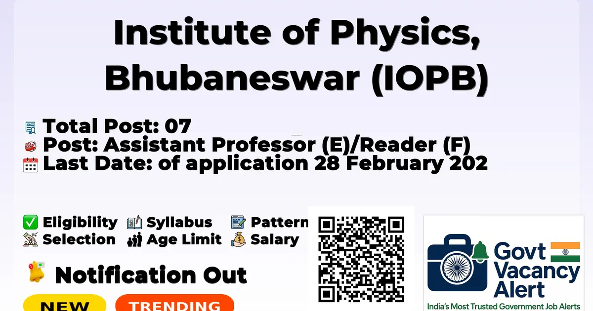 Company Name Institute of Physics, Bhubaneswar (IOPB) Post Name Assistant Professor (E)/Reader (F) No of Posts 07 Advt No IOP/Recruit/02/2026 Salary Level-12/13 Qualification at least two/five years of post-doctoral experiences in the relevant field for Assistant Professor (E) / Reader (F) as applicable. Age Limit Preferably below 35 / 38 years Last Date 28 February 2026 Official Website https://www.iopb.res.in