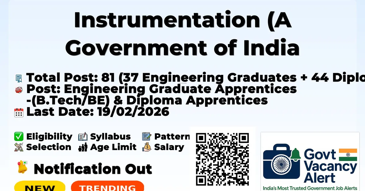 Instrumentation has released an official notification for the recruitment of 81 Apprentices Posts. Interested and eligible candidates can apply Offline through the official Instrumentation website. The last date to submit the application form is 19-02-2026. In this article, you’ll find the Instrumentation Apprentices Posts recruitment details, including eligibility criteria, age limit, salary structure, selection process, application steps, and direct links to the official notification and Offline application form.