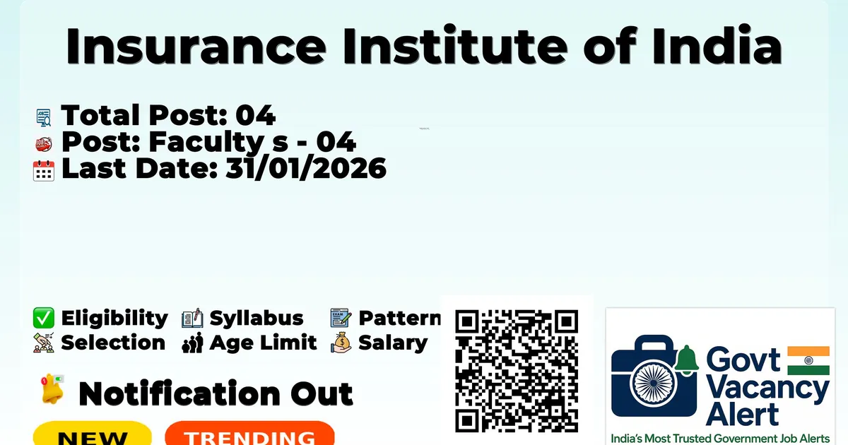 The Insurance Institute of India (III) has released an official advertisement for the recruitment of Faculty Members (General Insurance) for its College of Insurance. Applications are invited from experienced professionals in the insurance sector for contractual and permanent positions at Kolkata and Mumbai locations. Eligible candidates aged between 55 to 62 years (for contractual posts) and 35 to 55 years (for permanent Assistant Professor post) can apply as per the prescribed format before the closing date.