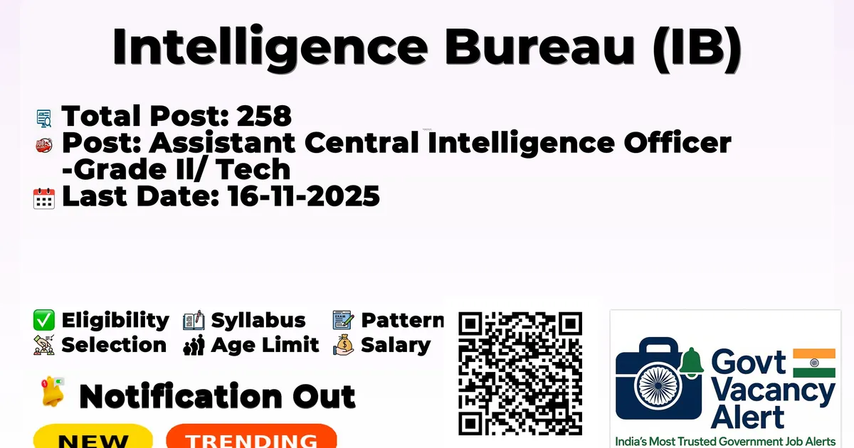 Intelligence Bureau (IB) has released an official notification for the recruitment of 258 Assistant Central Intelligence Officer Grade Il/ Tech Posts. Interested and eligible candidates can apply Online through the official Intelligence Bureau website. The last date to submit the application form is 16-11-2025. In this article, you’ll find the Intelligence Bureau Assistant Central Intelligence Officer Grade Il/ Tech Posts recruitment details, including eligibility criteria, age limit, salary structure, selection process, application steps, and direct links to the official notification and Online application form.