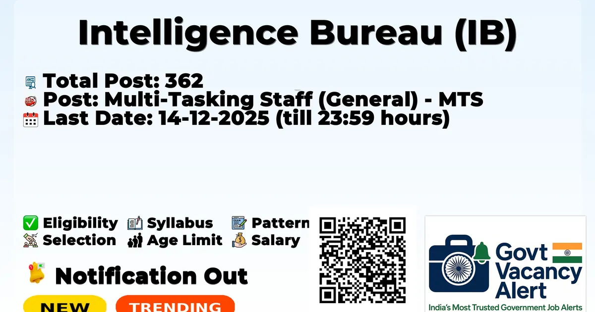 Company Name Intelligence Bureau (IB) Post Name Multi-Tasking Staff (General) - MTS No of Posts 362 Salary Rs. 18,000 – 56,900 (Level 1) Qualification Matriculation (10th pass) Age Limit 18 to 25 years (as on 14-12-2025) Start Date for Apply 22-11-2025 Last Date for Apply 14-12-2025 (till 23:59 hours) Official Website https://mha.gov.in