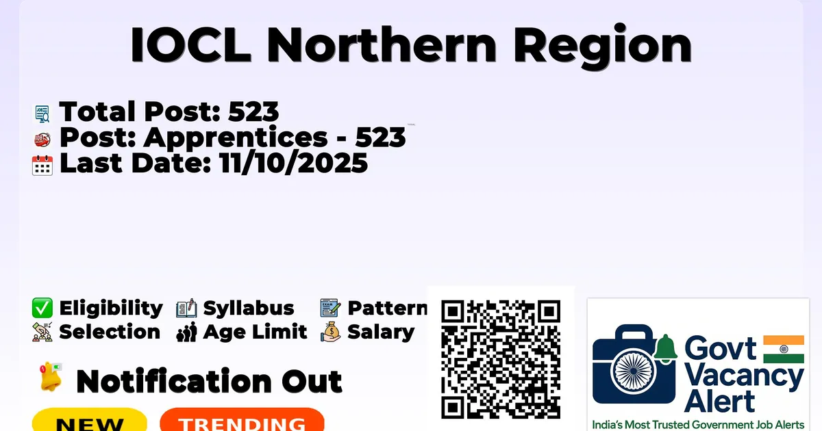Post Names Trade, Technician, Graduate Apprentices Total Vacancies 523 Age Limit 18 – 24 years as on 30/09/2025 Monthly Salary As per Apprentices Act Minimum Qualification 10th, 12th, ITI, Diploma, Graduate Degree Selection Process Merit List, Document Verification Job Location Northern Region (Delhi, Haryana, Punjab, Chandigarh, HP, J&K, UP, Rajasthan, Uttarakhand) Last Date 11/10/2025