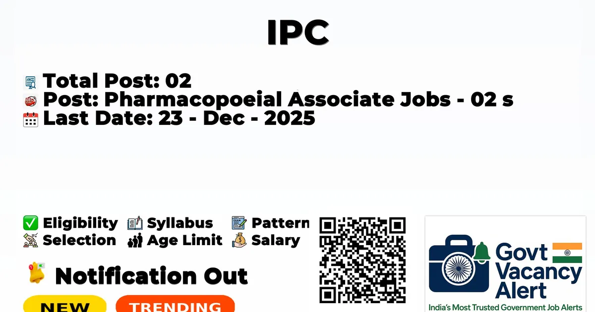 The Indian Pharmacopoeia Commission (IPC) has declared the official notification for 2025. To fill up the vacancies for 02 Pharmacopoeial Associate Jobs. Those candidates who have qualified in the Post Graduation, M.Pharm, can grab this chance and apply for the IPC Recruitment 2025. Here, we include the age limit, selection process, salary structure, education details, application fee, and how to apply for these posts. Interested candidates can attend the walk-in at the address given below.