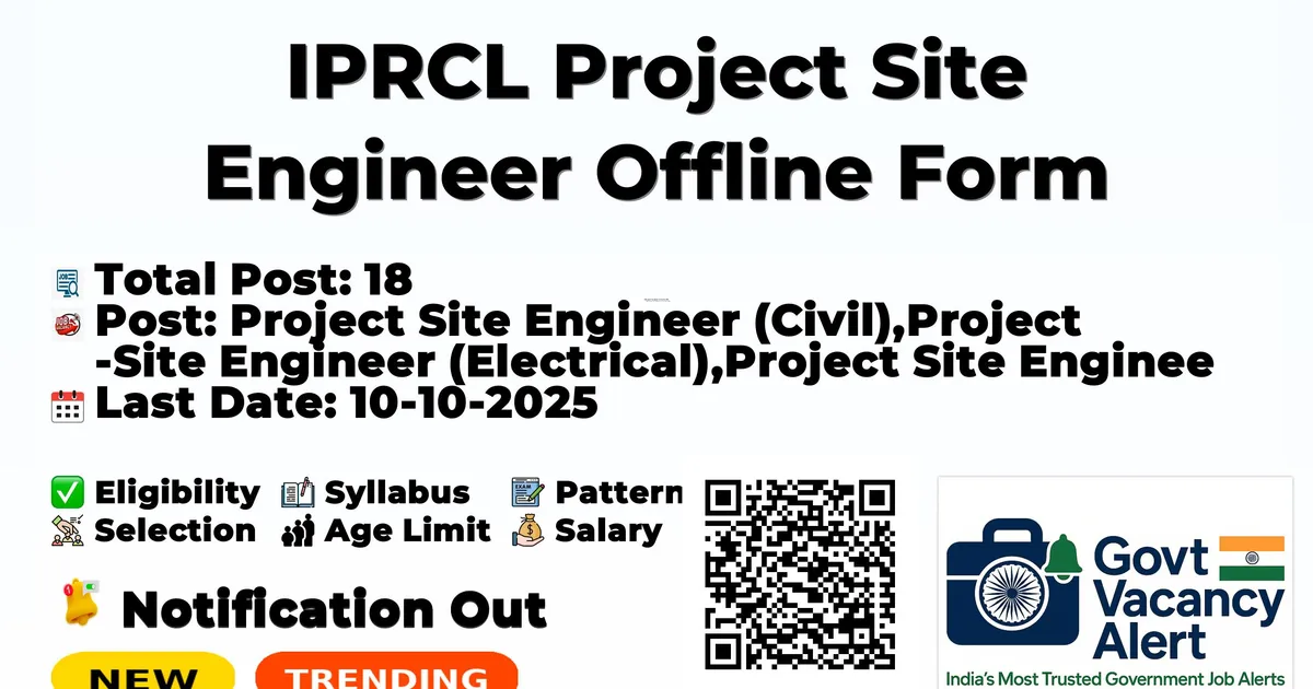 The Indian Port Rail and Ropeway Corporation (IPRCL) Recruitment 2025 for 18 posts of Project Site Engineer. Candidates with B.Tech/B.E Can Apply Offline. The Offline application opens on 08-09-2025, and closes on 10-10-2025. The candidate shall apply Offline through IPRCL website, iprcl.in.