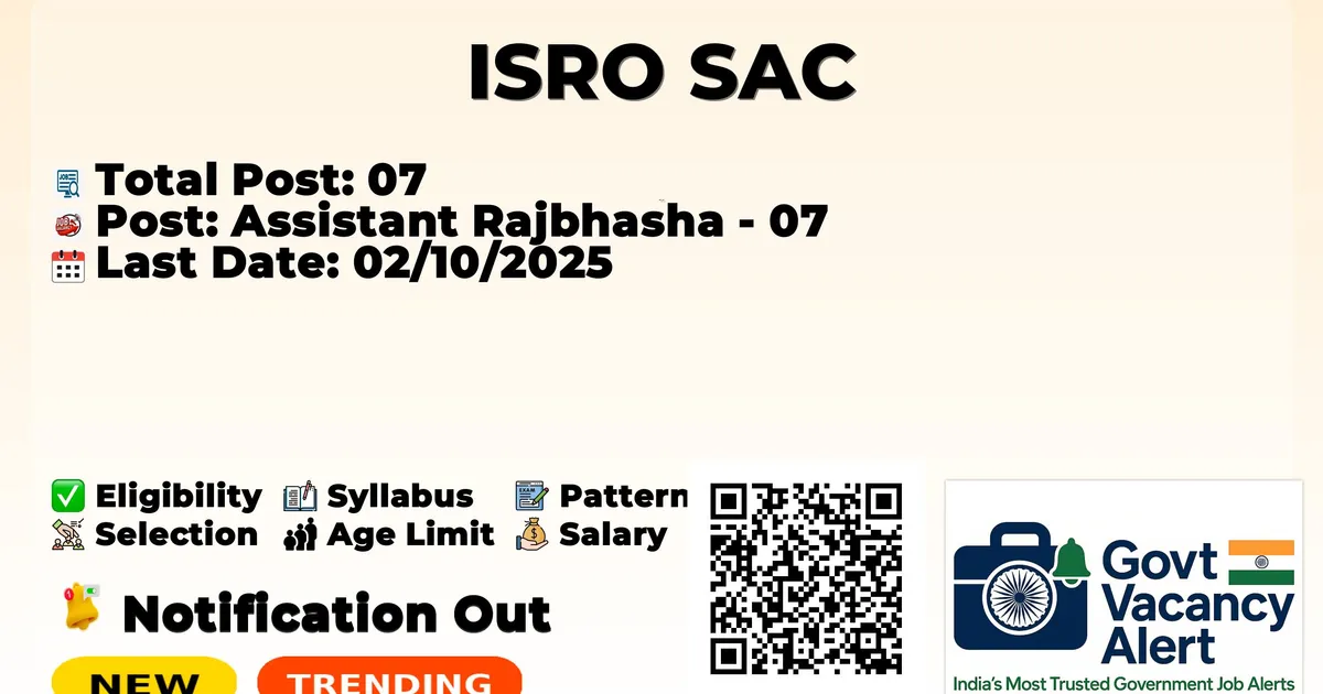 ISRO SAC Assistant (Rajbhasha) Recruitment 2025 Notification Out. The Space Applications Centre (SAC) under the Indian Space Research Organisation (ISRO) has announced Advertisement No. SAC:02:202 inviting online applications for 07 contractual posts of Assistant (Rajbhasha) across various ISRO Centres/Units and the Indian Institute of Space Science and Technology (IIST), an autonomous body under the Department of Space.