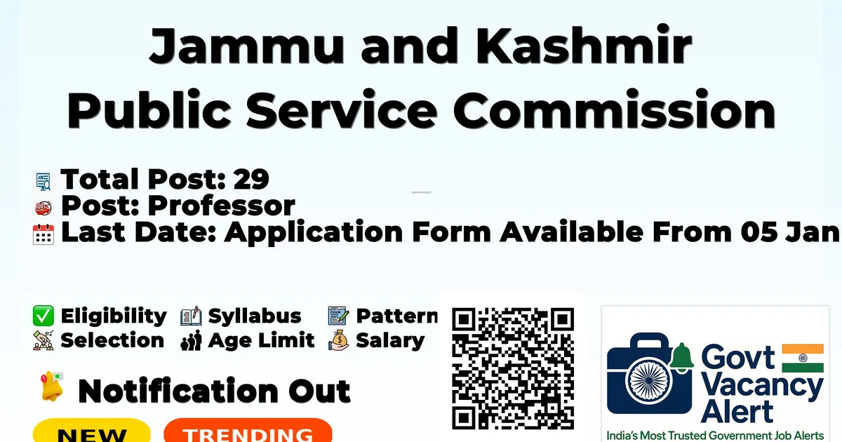Jammu and Kashmir Public Service Commission (JKPSC) has released an official notification for the recruitment of 29 Professor Posts. Interested and eligible candidates can apply Online through the official JKPSC website. The last date to submit the application form is 04-02-2026. In this article, you’ll find the JKPSC Professor Posts recruitment details, including eligibility criteria, age limit, salary structure, selection process, application steps, and direct links to the official notification and Online application form.