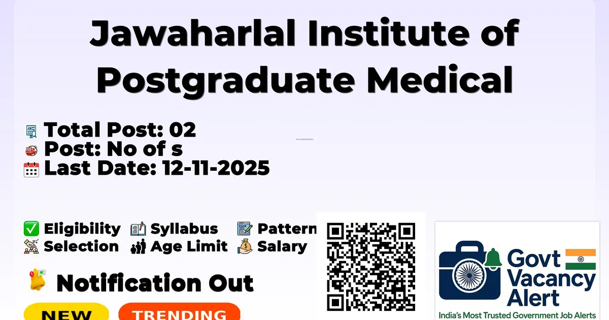 Company Name Jawaharlal Institute of Postgraduate Medical Education and Research (JIPMER) Post Name Project Technical Support, Project Research Scientist No of Posts 02 Pay Matrix Rs.21600 - 67200 Qualification B.Sc, Post Graduate, DMLT Age Limit 30 to 35 years Start Date for Apply 29-10-2025 Last Date for Apply 12-11-2025 Official Website jipmer.edu.in