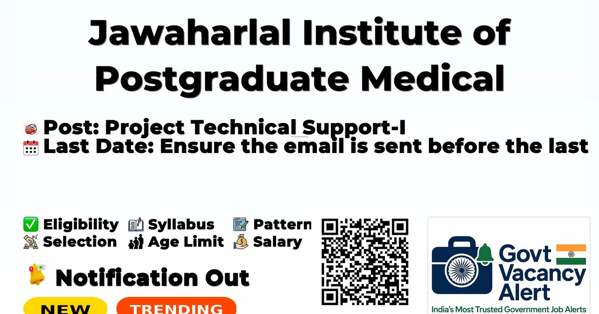 Jawaharlal Institute of Postgraduate Medical Education and Research has released the JIPMER Project Technical Support-I Recruitment 2026 notification for contractual Project Technical Support-I post under a research project. This opportunity is open to candidates with qualifications such as 10th in Science with Diploma in MLT/DMLT and relevant experience, or a three-year graduate degree in a related field with one year of experience, within the prescribed maximum age limit of 28 years. FreeJobAlert - Your Personal Govt Job Finder 10M+Users 100+Jobs/day FreeAlways ⚡ Get Custom Govt Job Alerts - Alerts by Qualification, State and Interest. Set Free Alerts ● Free · No spam · Unsubscribe anytime · freejobalert.com Selected candidates will receive a monthly salary ranging from ₹18,000 to ₹28,000 and will be recruited through a selection process consisting of a written test followed by an interview. The application process is completely email-based, and interested candidates must submit their applications on or before 10 April 2026, making it a good opportunity for candidates seeking project-based healthcare/research jobs in a reputed institute. Advertisement Company Name Jawaharlal Institute of Postgraduate Medical Education and Research (JIPMER) Post Name Project Technical Support-I Salary Rs.18000 + HRA (as per ICMR rules) Qualification Diploma in MLT/DMLT OR Three years Graduate degree Age Limit Max: 28 years Last Date 10-04-2026 Apply Mode Email Job Type Contract Candidates should download and read the JIPMER Jobs 2026 notification PDF carefully to check vacancy details, eligibility, age limit, and application instructions. The notification also includes important dates and selection process details. The direct download link is available in the Important Links section below. Download JIPMER Project Technical Support-I Job 2026 Notification PDF Project Technical Support-I: 10th in Science with Diploma in MLT/DMLT or equivalent and 2 years of experience in the relevant subject/field. Three years Graduate degree in relevant subject/field + one year of experience in relevant subject/field. Category Fee All No application fee is mentioned in the official notification. Maximum Age Limit: 28 years. Age relaxation will be as per government rules. Rs.18000 + HRA (as per ICMR rules) Event Date Last date for sending complete applications by email 10 April 2026 Time of Written Test 13 April 2026 Written test Interview Candidates who wish to apply for JIPMER Project Technical Support-I Recruitment 2026 via email should follow the steps below. Read the official notification carefully before applying. Prepare your application with complete bio-data including personal details, educational qualifications, and experience. Attach self-attested copies of all required documents such as educational certificates, experience certificates, ID proof, and recent passport-size photographs. Clearly mention the post applied for in the subject line of the email. Send the complete application to the official email address mentioned in the notification. Ensure the email is sent before the last date: 10-04-2026. Keep a copy of the sent email for future reference. Official Notification PDF: Project Technical Support-III- Sr. Lab. Assistant- 1 Click here Official Notification PDF: Project Technical Support-I Click here Official Website Click here Other Active JIPMER Recruitment 2026 Job Openings Last Date Apply Now Data Entry Operator Jobs - 1 Posts 01-01-1970 View Details Project Technical Support - III Jobs - 1 Posts 22-03-2026 View Details Assistant Professor, Senior Resident Jobs 13-04-2026 View Details