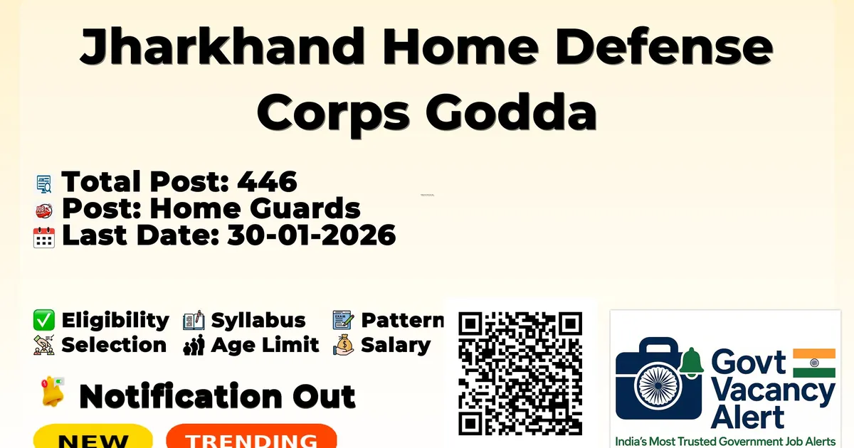 Company Name Jharkhand Home Defense Corps Godda Post Name Home Guards No of Posts 446 Qualification 10TH, 7TH Age Limit 19 to 40 years Start Date for Apply Online 20-12-2025 Last Date for Apply Online 30-01-2026 Official Website recruitment.jharkhand.gov.in
