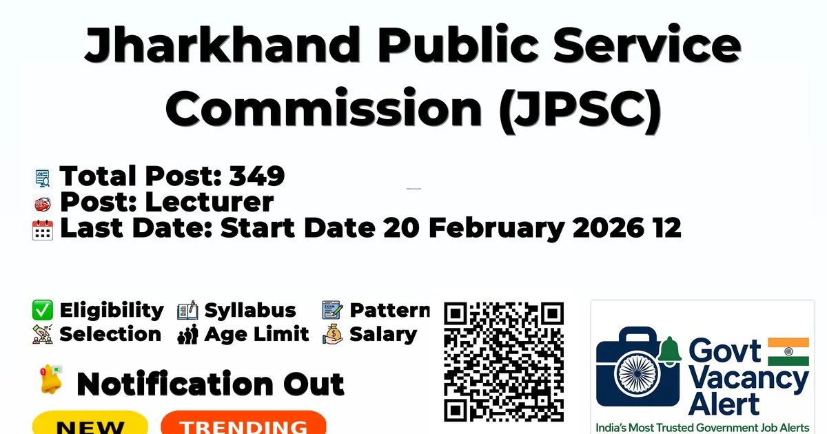Jharkhand Public Service Commission (JPSC) has released an official notification for the recruitment of 349 Lecturer Posts. Interested and eligible candidates can apply Online through the official JPSC website. The last date to submit the application form is 12-02-2026. In this article, you’ll find the JPSC Lecturer Posts recruitment details, including eligibility criteria, age limit, salary structure, selection process, application steps, and direct links to the official notification and Online application form. Advertisement Company Name Jharkhand Public Service Commission (JPSC) Post Name Lecturer No of Posts 349 No 04/2026 Salary Entry Pay Rs. 56,100/- Level 9A Entry Pay Rs. 57,700/- Level 10 Qualification B.E/B.Tech/B.S./Master's Degree/NET Age Limit less than 65 years Start Date 20 February 2026 Last Date 12 March 2026 Official Website www.jpsc.gov.in Trending Govt Jobs India Post GDS Online Form 2026 Indian Army Agniveer Recruitment Rally Notification 2026 RRB 22000 Group D Online form 2026 AIIMS NORCET 10 Recruitment Short Notice 2026 NTPC Executive Trainees 515 Online Form 2026 Discipline Name Total Vacancies Automobile Engineering 04 Chemistry 21 Civil Engineering 40 Computer Science & Engineering 66 Dress Design & Garment Manufacturing 10 Electrical Engineering 45 Electrical & Electronics Engineering 19 Electronics & Communication Engineering 18 English 18 Interior Design 04 Mathematics 30 Mechanical Engineering 43 Mechanical Engineering Automobile 04 Metallurgical Engineering 05 Mining Engineering 08 Physics 14 Total 349 Qualification For Engineering/Technology: B.E/ B.Tech/B.S. in relevant discipline with First class or equivalent. For Science and Humanities: Master's Degree in appropriate subject with First Class or equivalent at Bachelor's or Master's level. For Engineering/Technology: Bachelor's and Master's Degree in relevant discipline with First class in either of the two at the time of selection. For Science and Humanities: A Master's Degree with First Class or equivalent in a relevant subject and, must have cleared the National Eligibility Test (NET) conducted by the UGC or the CSIR, or a similar test accredited by the UGC, like SLET/SET. Essential Qualification Required Qualification and Experience for direct appointment in Diploma Institutions Desirable Qualification Minimum qualification required for Dress Design & Garment Manufacturing and Interior Design will be as per qualification required for Engineering/Technology as mentioned in the table above. Experience Teaching/Post Doctoral Experience (02 marks for one year each)# Pay Scale- Entry Pay Rs. 56,100/- Level 9 'A' Entry Pay Rs. 57,700/- Level 10 The retirement age for the post of Lecturer in Government Polytechnic/Government Women Polytechnic Institutes is 65 years. According to the Jharkhand Technical Education Service Rules, 2024, there is no minimum age limit for candidates to apply. The maximum age limit for applying is 65 years or less. The examination fee for candidates belonging to Unreserved, Economically Weaker Section (EWS), Extremely Backward Classes (Schedule-I) and Backward Classes (Schedule-II) is Rs.600 (Six Hundred) only. The examination fee for Scheduled Tribe/Scheduled Caste candidates of Jharkhand State is Rs.150/- (One Hundred Fifty) only. Disabled candidates (minimum 40% relevant disability) are exempted from examination fee. Start Date 20 February 2026 Last Date 12 March 2026 Fee Payment Last Date 14 March 2026 Hard Copy Submission Last Date 25 March 2026 Age Calculation Date 1 August 2025 As per sl. No. 1 to 8 of above Table, merit list will be made and 05 times candidates against each post will be called for document verification. After document verification, amongst the candidates present in document verification, 03 times candidates against each post will be called for interview. Selection of candidates will be done as per the Merit list prepared as per Marks obtained for Academic Record/Achievements and Interview as per the Table above. The process of selection of Lecturer in Polytechnics shall involve the inviting of the application developed by the Jharkhand Public Service Commission (JPSC), based on the Assessment Criteria and Methodology guidelines set out in Table of clause 8 of advertisement and reprints of all significant publications of the candidates provided that the publications submitted by the candidate have been published during the qualifying period. The Commission shall prepare a merit list in order of preference furnished by the candidate and on the basis of vacancies and reservation roster and shall send recommendation to the appointing authority Final merit list shall be prepared from the aggregate marks obtained in both academic and interview stages. In the event of total marks obtained from educational qualifications, interview and experience being the same, candidates having higher marks in Post Graduation will be placed higher in the final merit list. In the event of candidate having same educational qualifications marks, candidate who is older in age according to the date of birth will be placed higher in the final merit list. Note - The number of posts may increase or decrease depending on the outcome of the judgments passed in case no. 3419/2020 (Anand Kumar Dalai vs. State of Jharkhand and others), 525/2016 (Dr. Pankaj Kumar vs. State of Jharkhand and others), 2185/2016 (Uttam Kumar vs. State of Jharkhand and others) and 1922/2017 (Bandana Kumari vs. State of Jharkhand and others) filed in the Hon'ble High Court. Note:- If any candidate attains 65 years of age during the selection process, his/her candidature will not be considered. # (a) However, if the period of continuous teaching/Post-doctoral experience is less than one year but more than six months then 01 mark shall be provided. No fractional marks to be given. (b) Need Based Teachers/Contractual Teachers recruited under the Higher and Technical Education Department, Government of Jharkhand will