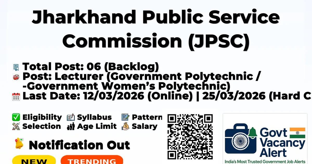 Jharkhand Public Service Commission (JPSC) has released an official notification for the recruitment of 06 Lecturer Posts. Interested and eligible candidates can apply Online through the official JPSC website. The last date to submit the application form is 12-03-2026. In this article, you’ll find the JPSC Lecturer Posts recruitment details, including eligibility criteria, age limit, salary structure, selection process, application steps, and direct links to the official notification and Online application form. Advertisement Company Name Jharkhand Public Service Commission (JPSC) Post Name Lecturer (Government Polytechnic / Government Women’s Polytechnic) No of Posts 06 (Backlog) Advt No 03/2026 Salary Entry Pay Rs. 56,100/- (Level 9A) or Rs. 57,700/- (Level 10) Qualification B.E/B.Tech/B.S. with First Class (Engineering) OR Master’s Degree with First Class (Science & Humanities) Age Limit Below 65 years (as on 01.08.2025) Start Date for Apply 20/02/2026 Last Date for Apply 12/03/2026 (Online) | 25/03/2026 (Hard Copy by 5:00 PM) Official Website www.jpsc.gov.in Trending Govt Jobs India Post GDS Online Form 2026 Aadhaar Operator Supervisor Online Form 2026 Indian Army Agniveer Recruitment Rally Notification 2026 RRB 22000 Group D Online form 2026 AIIMS NORCET 10 Recruitment Short Notice 2026 S.No. Discipline / Subject Total Vacancies 1. Computer Science Engineering 01 (BC-I) 2. Electronics & Communication Engineering 01 (SC) 3. English 01 (BC-I) 4. Physics 03 (ST-01, SC-01, BC-I-01) Total 06 Qualifications: For Engineering/Technology – B.E/B.Tech/B.S. in relevant discipline with First Class or equivalent. For Science and Humanities – Master’s Degree in appropriate subject with First Class or equivalent at Bachelor’s or Master’s level. Essential qualifications: As per AICTE norms for direct appointment in Diploma Institutions. Desirable: NET/JET, GATE, Ph.D., Research Publications, Teaching Experience. Experience: Teaching/Post Doctoral experience gives additional marks (02 marks per year, max 04 marks). Pay Scale: Level-9A (Entry Pay Rs. 56,100/-) or Level-10 (Entry Pay Rs. 57,700/-) Probation Period: 2 years Maximum Age limit: Below 65 Years Age relaxation is applicable as per rules. Event Date Online Application Start Date 20/02/2026 Last Date for Online Application 12/03/2026 (05:00 PM) Last Date for Receipt of Hard Copy 25/03/2026 (05:00 PM) Starting Date for Apply Online: 20-02-2026 Last Date for Apply Online: 12-03-2026 Academic Record / Achievements (80 marks) + Interview (20 marks) = Total 100 marks Merit list prepared on the basis of combined score Document verification before interview Only Jharkhand domiciled candidates are eligible for reservation benefits. All documents must be uploaded online and hard copies sent by post. Incomplete applications or applications received after last date will be rejected. The Commission reserves the right to modify or cancel the advertisement. Register / Login on www.jpsc.gov.in using OTR (One Time Registration) Fill online application form carefully and upload all required documents Pay application fee online Take printout of filled application form Send printed application along with self-attested copies of all documents by Registered/Speed Post or in person so as to reach the Commission by 25.03.2026 (05:00 PM) Apply Online: Click here Official Notification PDF: Click here Official Website: Click here Join Arattai Channel: Click Here Join Telegram Channel: Click Here Join WhatsApp Channel: Click Here Sarkari Result: Click Here Download Mobile App: Click Here