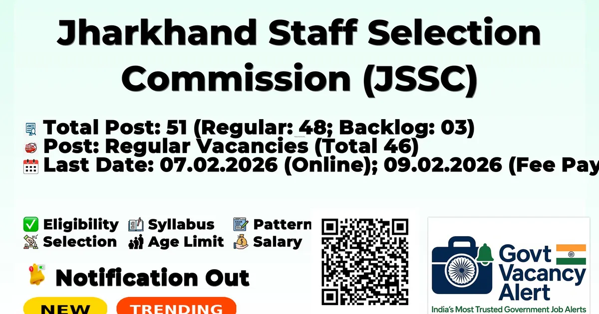 Company Name Jharkhand Staff Selection Commission (JSSC) Post Name Para Medical Worker (Multiple Posts) No of Posts 51 (Regular: 48; Backlog: 03) Salary Level-1 to Level-5 in the Pay Matrix (₹18,000-₹92,300) Qualification 10th/I.Sc. with Diploma/Training in relevant medical field Age Limit 20 to 40 years (Relaxation applies) Start Date for Apply 08.01.2026 Last Date for Apply 07.02.2026 (Online); 09.02.2026 (Fee Payment) Official Website www.jssc.jharkhand.gov.in