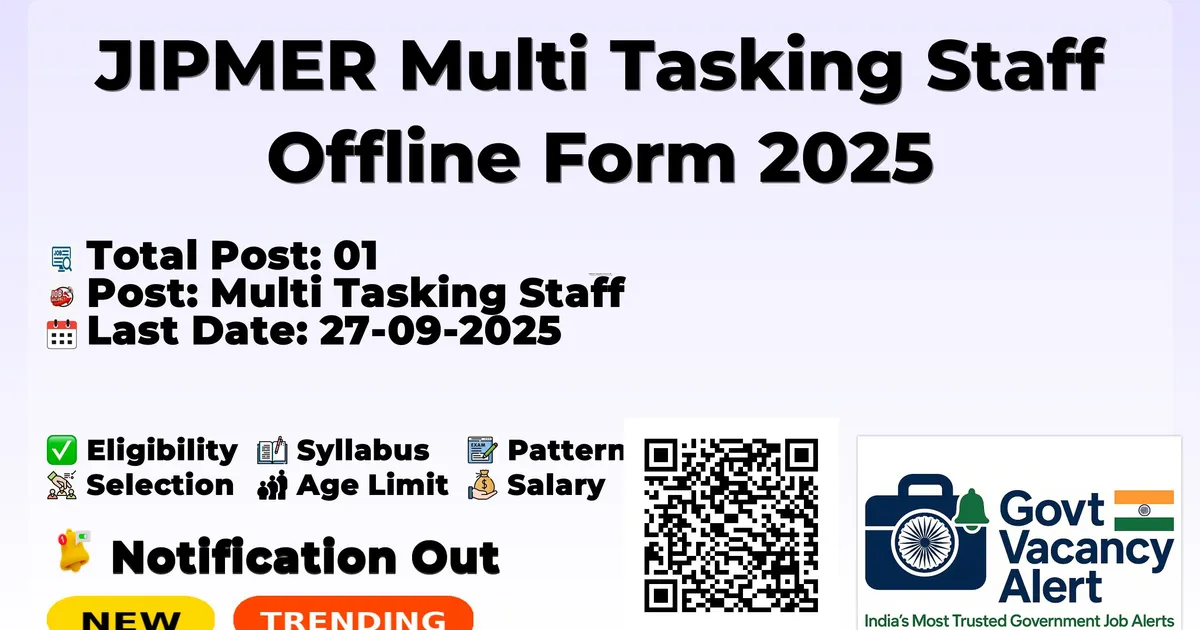 The Jawaharlal Institute of Postgraduate Medical Education and Research (JIPMER) Recruitment 2025 for 01 posts of Multi Tasking Staff. Candidates with 10TH Can Apply Offline. The Offline application opens on 11-09-2025, and closes on 27-09-2025. The candidate shall apply Offline through JIPMER website, jipmer.edu.in.