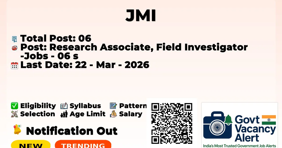 The Jamia Millia Islamia (JMI) has officially released the notification to fill the vacancies of 06 Research Associate/ Field Investigator Posts. Interested and eligibile candidates can use this opportunity to apply for these posts before the last date of application. Candidates who have completed their B.E./B.Tech in Civil Engineering, M.E./M. Tech, M.Sc., Ph.D., can apply for the JMI Notification 2026. The interested applicants can apply in offline mode. Here we have mentioned the education details, age limit, selection process, application fee, salary, and how to apply for these posts before the deadline. The application dates have already begun.