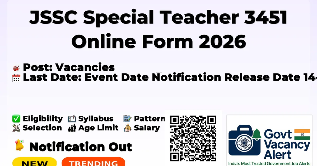 Details Information Organization Name Jharkhand Staff Selection Commission (JSSC) Post Name Special Teacher Total Vacancies 3451 Posts Salary/Pay Scale Rs 25,500 to 92,300 Educational Qualification Any Graduate, B.Ed, 12TH, D.El.Ed Age Limit 21 to 40 years (Age relaxation as per rules) Application Start Date 14-12-2025 Application End Date 13-01-2026 Application Mode Online Official Website jssc.jharkhand.gov.in