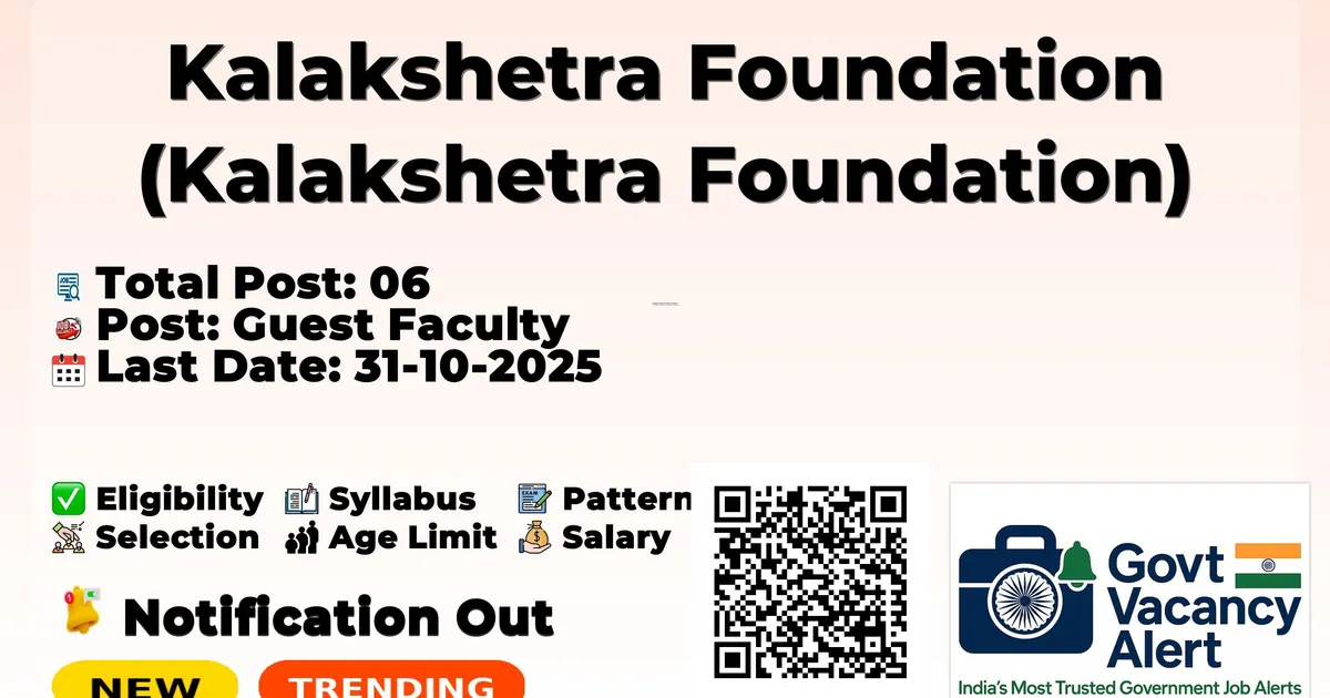 Kalakshetra Foundation (Kalakshetra Foundation) has released an official notification for the recruitment of 06 Guest Faculty Posts. Interested and eligible candidates can apply Offline through the official Kalakshetra Foundation website. The last date to submit the application form is 31-10-2025. In this article, you’ll find the Kalakshetra Foundation Guest Faculty Posts recruitment details, including eligibility criteria, age limit, salary structure, selection process, application steps, and direct links to the official notification and Offline application form. Join Our Arattai Channel: Join Here Advertisement Company Name Kalakshetra Foundation (Kalakshetra Foundation) Post Name Guest Faculty No of Posts 06 Pay Matrix Rs 20,000 to Rs 36,000 per month Qualification PG Diploma Age Limit 60 years Last Date for Apply 31-10-2025 Official Website kalakshetra.in Post Diploma in BharatanatyamfromKalakshetra Foundation. Maximum Age limit: 60 Years Last Date for Apply: 31-10-2025 Completed Application, as prescribed below, should be submittedtotheDirector, Kalakshetra Foundation, Thiruvanmiyur, Chennai - 600 041soastoreach KF by 31.10.2025 (Friday) Official Notification PDF: Click here Official Website: Click here Join Arattai Channel: Click Here Join Telegram Channel: Click Here Join WhatsApp Channel: Click Here Download Mobile App: Click Here Jobs In Tamil Nadu Ariyalur Chennai Chidambaram Coimbatore Cuddalore Dharmapuri Dindigul Erode Hosur Kancheepuram Kanniyakumari Karaikal Karur Krishnagiri Kumbakonam Madurai Nagapattinam Nagercoil Namakkal Nilgiris Ooty Perambalur Pudukkottai Ramanathapuram Salem Sivaganga Thanjavur Theni Thiruvallur Thiruvarur Tirunelveli Tirupathur Tiruppur Tiruvannamalai Trichy Tuticorin Vellore Viluppuram Virudhunagar Also Read SEBI Recruitment 2025 - Officer Grade A (Assistant Manager) Vacancies - Rs 62500 to 126100 Salary - Apply Now IPPB GDS Recruitment 2025 - 300+ Gramin Dak Sevaks Executive Vacancies - 30,000 Salary - Graduate Candidaes Can Apply RRB Recruitment 2025 - 2500+ JE (Junior Engineer) Vacancies - 35400 Monthly Salary - Apply Now Jobs By Education 10TH Jobs› 8TH Jobs› 12TH Jobs› Diploma Jobs› ITI Jobs› B.Tech/B.E Jobs› B.com Jobs› Any Graduate Jobs› Any Post Graduate Jobs› New Updates RRB NTPC 5,810 Online Form 2025 India Post IPPB GDS Online Form 2025 Territorial Army Rally 1426 Soldier Online Form 2025 Intelligence Bureau (IB) ACIO II Tech Online Form 2025 BSF 391 Constable (General Duty) Online Form 2025 SSC Delhi Police 7565 Constable Online Form 2025 UCO Bank Apprentices Online Form 2025 RRB NTPC 8850 Online Form 2025-26 SEBI Officer Grade A Online Form 2025 View All BRO 542 MSW, Vehicle Mechanic Offline Form 2025 RITES 600 Senior Technical Assistant Online Form 2025 SSC Delhi Police 7565 Constable Online Form 2025 ISRO SDSC SHAR Various Vacancy Online Form 2025 SECL 543 Assistant Foreman Online Form 2025 ONGC 2623 Apprentices Online Form 2025 Delhi DDA Recruitment 2025 Online Form Out For 1732 Post RRB NTPC 8850 Online Form 202526 RRB 2570 JE (Junior Engineer) Online Form 2025 1. What is the last apply date for Kalakshetra Foundation Guest Faculty 2025? Ans: Last apply date is 31-10-2025. 2. What is the Eligibility to apply for Kalakshetra Foundation Guest Faculty 2025? Ans: PG Diploma 3. What is the Maximum Age Limit to apply for Kalakshetra Foundation Guest Faculty 2025? Ans: 60 Years 4. How many vacancies are being recruited by Kalakshetra Foundation Guest Faculty 2025? Ans: Total 06 Vacancies.