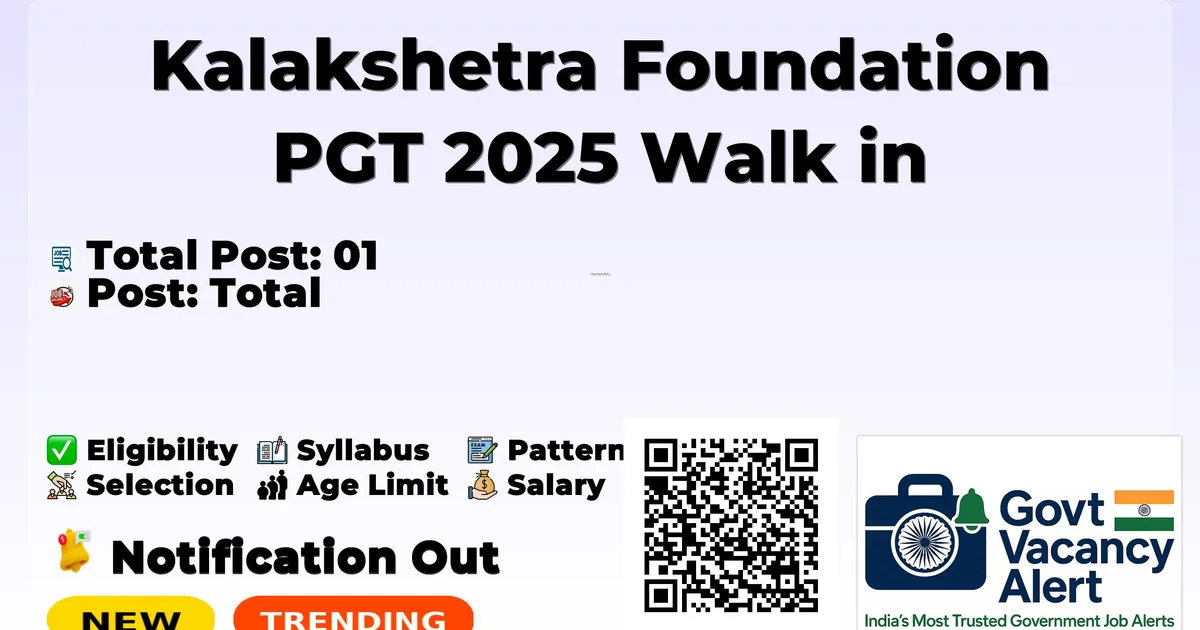 Advertisement Kalakshetra Foundation Recruitment 2025 for 01 posts of PGT. Candidates with Diploma, PG Diploma Can attend the walkin. The Walk-in on 06-11-2025. For detailed information please visit Kalakshetra Foundation official website, kalakshetra.in.
