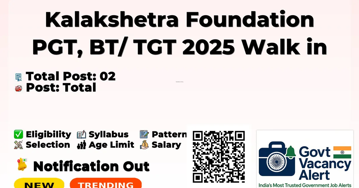 Kalakshetra Foundation Recruitment 2025 for 02 posts of PGT, BT/ TGT. Candidates with Any Bachelors Degree, B.Ed, Any Masters Degree Can attend the walkin. The Walk-in on 05-11-2025. For detailed information please visit Kalakshetra Foundation official website, kalakshetra.in.