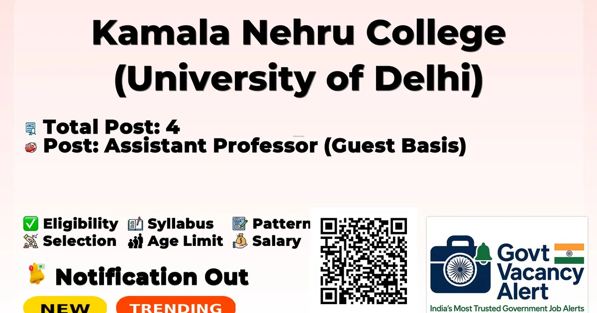 Company Name Kamala Nehru College (University of Delhi) Post Name Assistant Professor (Guest Basis) No of Posts 4 Qualification As prescribed for regular Assistant Professors in UGC/DU Regulations Official Website www.Kamala Nehru College.du.ac.in