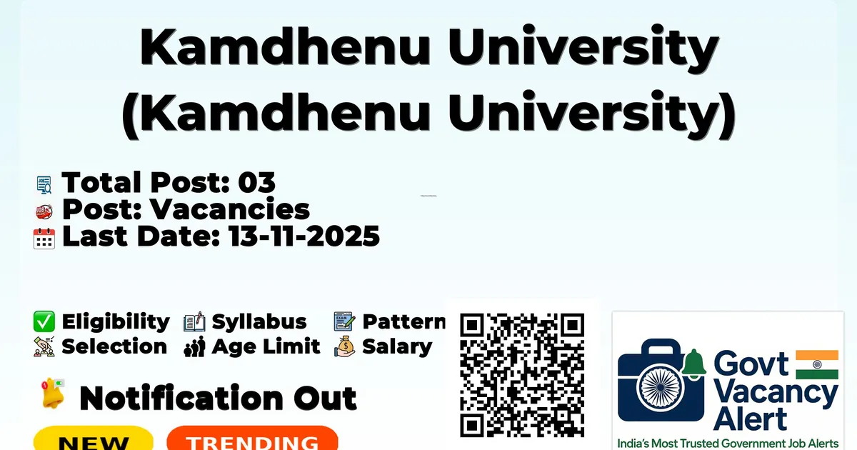 Kamdhenu University (Kamdhenu University) has released an official notification for the recruitment of 03 Research Associate, Senior Research Fellow Posts. Interested and eligible candidates can apply Offline through the official Kamdhenu University website. The last date to submit the application form is 13-11-2025. In this article, you’ll find the Kamdhenu University Research Associate, Senior Research Fellow Posts recruitment details, including eligibility criteria, age limit, salary structure, selection process, application steps, and direct links to the official notification and Offline application form.