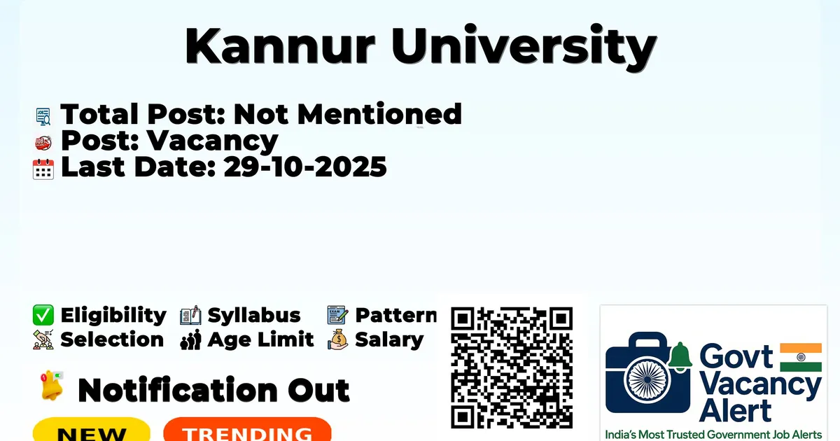 Kannur University has released an official notification for the recruitment of Swimming Coach, Swimming Pool Technician Posts. Interested and eligible candidates can apply Offline through the official Kannur University website. The last date to submit the application form is 29-10-2025. In this article, you’ll find the Kannur University Swimming Coach, Swimming Pool Technician Posts recruitment details, including eligibility criteria, age limit, salary structure, selection process, application steps, and direct links to the official notification and Offline application form.
