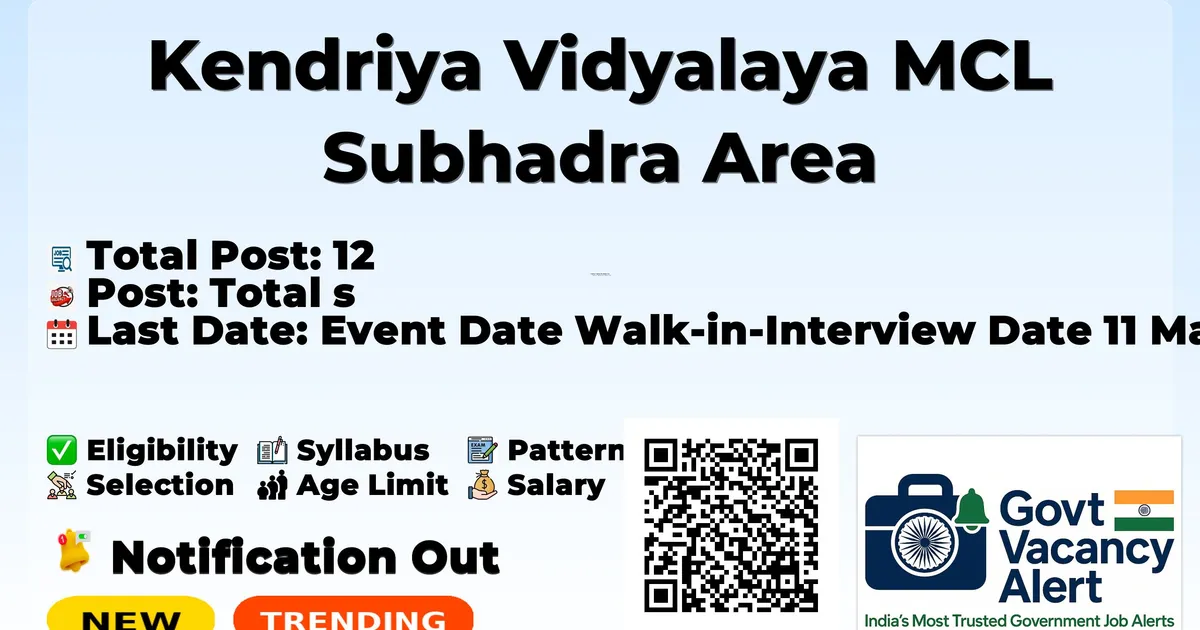 Kendriya Vidyalaya MCL Subhadra Area (KV MCL) has released an official notification for Walk-in Interview for 12 Multiple Teaching Positions Posts. Eligible candidates can attend the Walk-in Interview on 11-03-2026 at the KV MCL office with original documents and self-attested copies.