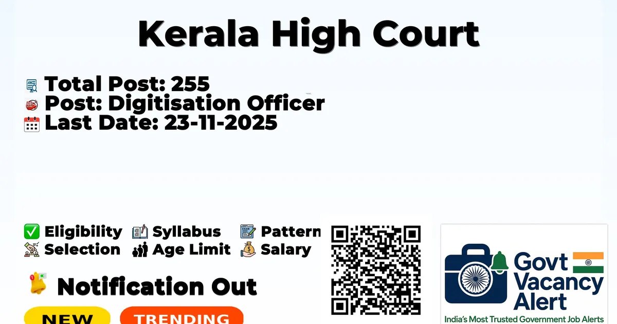 Company Name Kerala High Court Post Name Digitisation Officer No of Posts 255 Pay Matrix Rs 31,320 Qualification 10TH Age Limit not exceed 65 years Start Date for Apply Online 03-11-2025 Last Date for Apply Online 23-11-2025 Official Website highcourt.kerala.gov.in