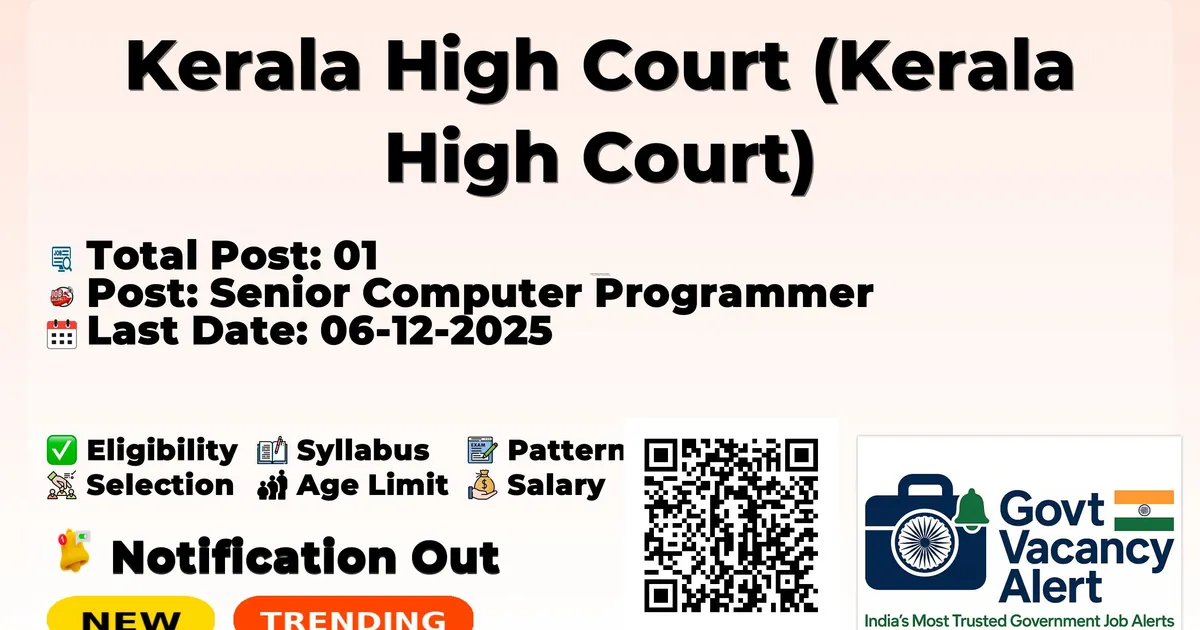 Company Name Kerala High Court (Kerala High Court) Post Name Senior Computer Programmer No of Posts 01 Salary Rs 60,000/- Qualification B.Tech/B.E, MCA Start Date for Apply Online 17-11-2025 Last Date for Apply Online 06-12-2025 Official Website highcourt.kerala.gov.in
