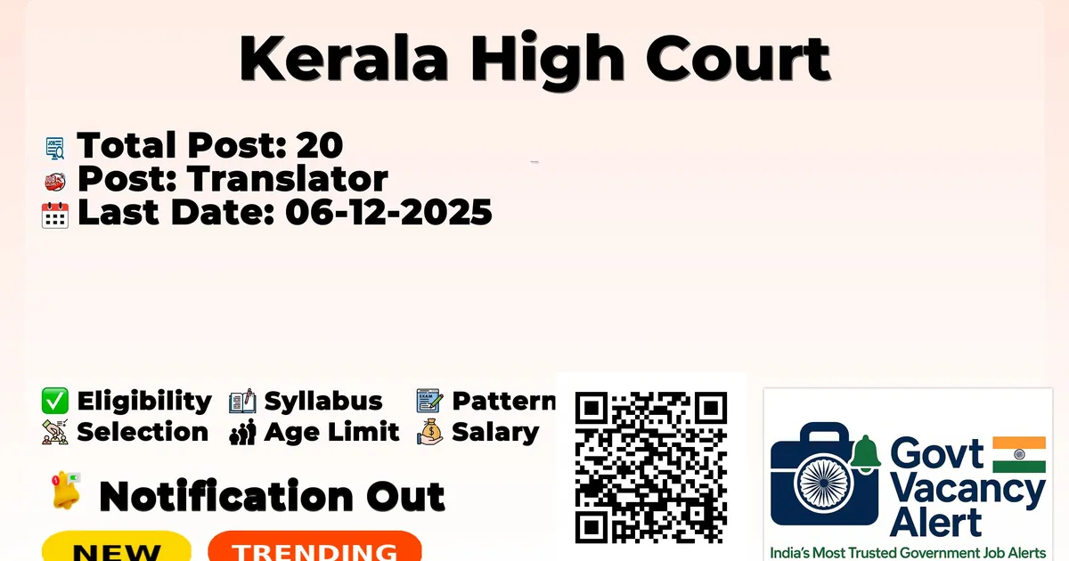 Company Name Kerala High Court Post Name Translator No of Posts 20 Salary Rs 31020 Qualification Any Bachelors Degree Advt No HCKL/7593/2025-REC1-HC KERALA Start Date for Apply Online 17-11-2025 Last Date for Apply Online 06-12-2025 Official Website highcourt.kerala.gov.in