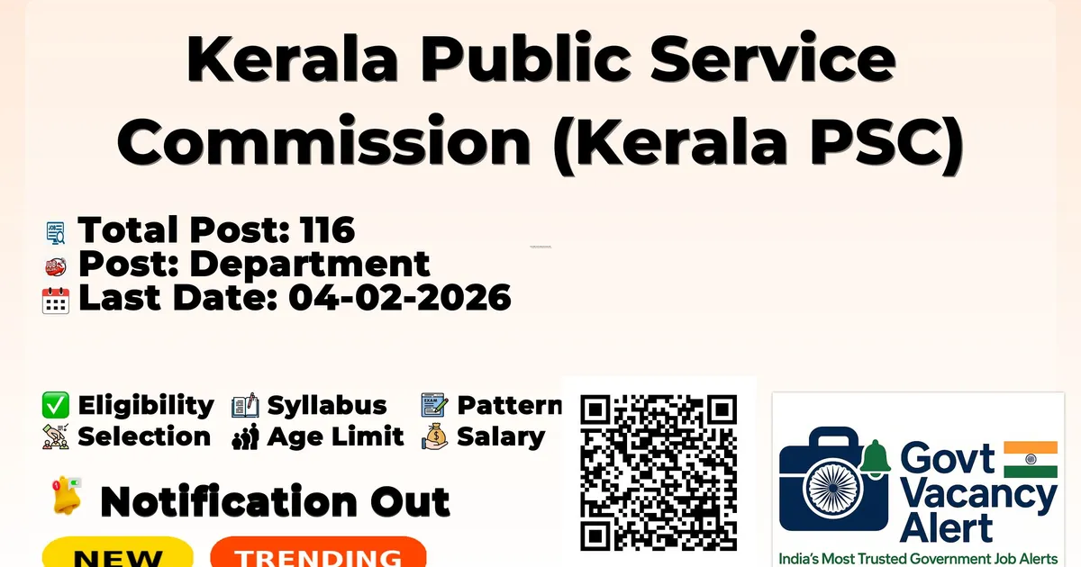 Kerala Public Service Commission (Kerala PSC) has released an official notification for the recruitment of 116 Clerk, LDC and Other Posts. Interested and eligible candidates can apply Online through the official Kerala PSC website. The last date to submit the application form is 04-02-2026. In this article, you’ll find the Kerala PSC Clerk, LDC and Other Posts recruitment details, including eligibility criteria, age limit, salary structure, selection process, application steps, and direct links to the official notification and Online application form. Trending Govt Jobs OSSSC 3,250 CRE Online Form 2026 RRB Isolated Category 08/2025 2026 RRB 22000 Group D Online form 2026 BARC Scientific Officers Online Form 2026 BSF Constable GD Online Form 2025-26 Advertisement Company Name Kerala Public Service Commission (Kerala PSC) Post Name Clerk, LDC and Other No of Posts 116 Salary Upto 1,23,700/- Qualification Any Graduate, Any Bachelors Degree, B.Tech/B.E, 12TH, 10TH, Any Masters Degree Age Limit 18 to 40 years Last Date for Apply Online 04-02-2026 Official Website keralapsc.gov.in Post Name Department Cat. No. Vacancies Manager (I T) Part I (General Category) Kerala State Co-operative Federation for Fisheries Development Ltd Cat.No.609/2025 01 Hospital Superintendent Pharmaceutical Corporation (IM) Kerala Ltd. Cat.No.610/2025 01 Higher Secondary School Teacher Psychology Kerala Higher Secondary Education Cat.No.611/2025 01 Higher Secondary School Teacher in Geology[Junior] Kerala Higher Secondary Education Cat.No.612/2025 01 Inspector of Legal Metrology Legal Metrology Cat.No.613/2025 Anticipated Assistant Manager (I T) Part I (Grl Catry.) Kerala State Co-operative Federation for Fisheries Development Ltd Cat.No.614/2025 01 Technical Assistant Kerala Drugs Control Cat.No.615/2025 Anticipated Security Guard (From Ex-Servicemen only) Govt. Secretariat/Kerala Public Service Commission Cat.No.616/2025 Anticipated Supervisor /Cashier (Finance, Accounts & Secretarial) Travancore Sugars & Chemicals Limited Cat.No.617/2025 01 Storeman Kerala Tourism Development Corporation Limited Cat.No.618/2025 01 Lower Division Clerk Kerala State Beverages (Manufacturing & Marketing) Corporation Limited Cat.No.619/2025 Anticipated Lower Division Clerk - PART-II (BY TRANSFER) Kerala State Beverages (M&M) Corporation Ltd. Cat.No.620/2025 Anticipated High School Teacher (Hindi) (Recruitment By Transfer) General Education Cat.No.621/2025 02 High School Teacher (Sanskrit) (Recruitment By Transfer) General Education Cat.No.622/2025 01 High School Teacher (English) (Recruitment By Transfer) General Education Cat.No.623/2025 01 High School Teacher (Sanskrit) General Education Cat.No.624/2025 04 L P School Teacher (Tamil Medium) General Education Cat.No.625/2025 01 Auxiliary Nurse Midwife Grade-II Insurance Medical Services Cat.No.626/2025 02 Pharmacist Grade II (Homoeo) Homoeopathy Cat.No.627/2025 Anticipated Copy Holder (Kannada) Printing Department Cat.No.628/2025 01 Treatment Organizer Grade-II Health Services Cat.No.629/2025 Anticipated Motor Mechanic Health Services Cat.No.630/2025 05 Lower Division Typist (Part-I) Various Cat.No.631/2025 Anticipated Lower Division Typist (By Transfer) (Part – II ) Various Cat.No.632/2025 - Tracer Local Self Government Cat.No.633/2025 03 Electrician Animal Husbandry Cat.No.634/2025 01 Part Time Junior Language Teacher (Sanskrit) General Education Cat.No.635/2025 04 Boat Driver Irrigation Cat.No.636/2025 01 Superintendent Welfare Institution Grade-I (SR for SC/ST only) Social Justice Department Cat.No.637/2025 02 I Grade Draftsman/ I Grade Overseer (Civil) (SR for ST Only) Public Works Cat.No.638/2025 01 Supervisor (ICDS) Women & Child Development Cat.No.639/2025 02 Havildar (Armed Police Battalion) (SR from ST Only ) Kerala Police Service Cat.No.640/2025 05 Pharmacist Grade II (SR for ST only) Health Services Cat.No.641/2025 01 Lecturer in Mridangam (I NCA - Muslim) Collegiate Education (Music Colleges) Cat.No.642/2025 03 Higher Secondary School Teacher URDU (Junior) (I NCA - SC) Kerala Higher Secondary Education Cat.No.643/2025 01 Higher Secondary School Teacher Arabic (Junior) (I NCA - Dheevara) Kerala Higher Secondary Education Cat.No.644/2025 01 Mate (Mines) (VII NCA - SC) Kerala Minerals and Metals Limited Cat.No.645/2025 01 Woman Police Constable (Women Police Battalion) (I NCA - SCCC) Kerala Police Cat.No.646/2025 01 Inspecting Assistant (I NCA - LC/AI) Legal Metrology Department Cat.No.647/2025 01 Assistant Manager (PART II (SOCIETY CATEGORY) (I NCA - SC/M/LC/AI)/OBC/E/T/B/V) KSC Bank Ltd. Cat.No.648-653/2025 10 High School Teacher (Arabic) (IX NCA - SC/ST/LC/AI/OBC) General Education Cat.No.654-657/2025 15 High School Teacher (Social Science) (II NCA - Viswakarma) General Education Cat.No.658/2025 01 High School Teacher (Natural Science) Malayalam Medium (I NCA - Hindu Nadar) General Education Cat.No.659/2025 01 High School Teacher (Urdu) (I NCA - SC) General Education Cat.No.660/2025 01 L.P. School Teacher (Kannada Medium) (I NCA - HN/LC/AI) General Education Cat.No.661&662/2025 03 Full Time Junior Language Teacher (Hindi) (I NCA - Muslim) General Education Cat.No.663/2025 01 Full Time Junior Language Teacher (Arabic) LPS (VII NCA - ST) General Education Cat.No.664/2025 01 Full Time Junior Language Teacher (Arabic) LPS (I&II NCA - V/HN/E/T/B/OBC/SC/ST) General Education Cat.No.665&670/2025 12 Confidential Assistant Grade-II (II NCA - E/T/B) Various Cat.No.671/2025 01 Clerk (Kannada and Malayalam Knowing) (I NCA - SCCC) Various Cat.No.672/2025 02 Clerk (From Ex-Servicemen Only) (I NCA - SIUCN/SC/HN) NCC/Sainik Welfare Department Cat.No.673-675/2025 04 Part Time Junior Language Teacher (Arabic) UPS (IX NCA - SC) General Education Cat.No.676/2025 01 Part Time Junior Language Teacher (Arabic) LPS (NCA - ST) General Education Cat.No.677/2025 03 Part Time Junior Language Teacher (Arabic) LPS (I NCA - E/B/T/SC) General Education Cat.No.678&679/2025 05 Part Time Junior Language 