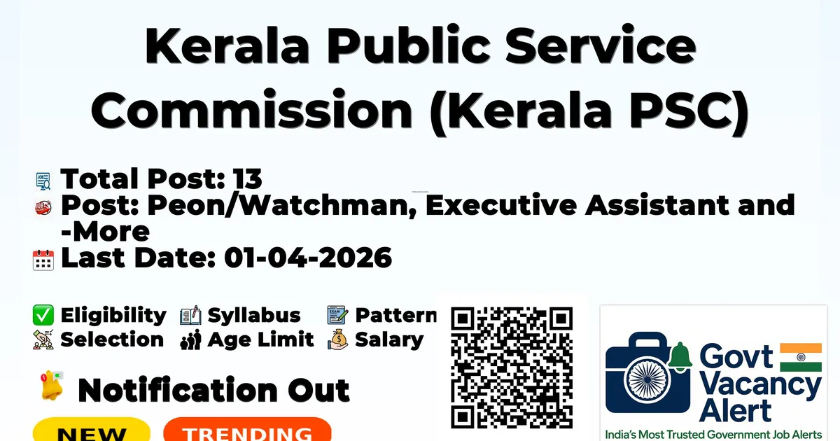 Company Name Kerala Public Service Commission (Kerala PSC) Post Name Peon/Watchman, Executive Assistant and More No of Posts 13 Salary Rs 26,500 to 79,000 Qualification Any Graduate, B.Com, B.Sc, Diploma, 6th Age Limit 18 to 50 years Last Date for Apply Online 01-04-2026 Official Website https://www.keralapsc.gov.in/