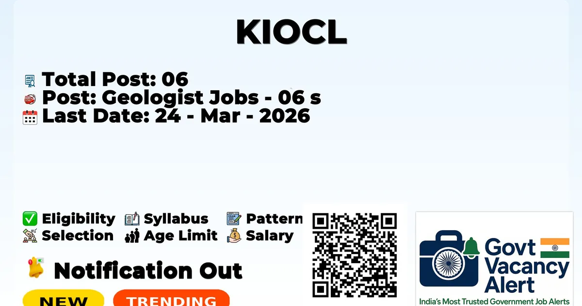 The Kudremukh Iron Ore Company Limited (KIOCL) has officially released the notification to fill the vacancies of 06 Geologist Posts. Interested and eligibile candidates can use this opportunity to apply for these posts before the last date of application. Candidates who have completed their Post-graduation, M.E./M. Tech, M.Sc can apply for the KIOCL Notification 2026. The interested applicants can attend the walk-in interview. Here we have mentioned the education details, age limit, selection process, application fee, salary, and how to apply for these posts before the deadline. The application dates have already begun.