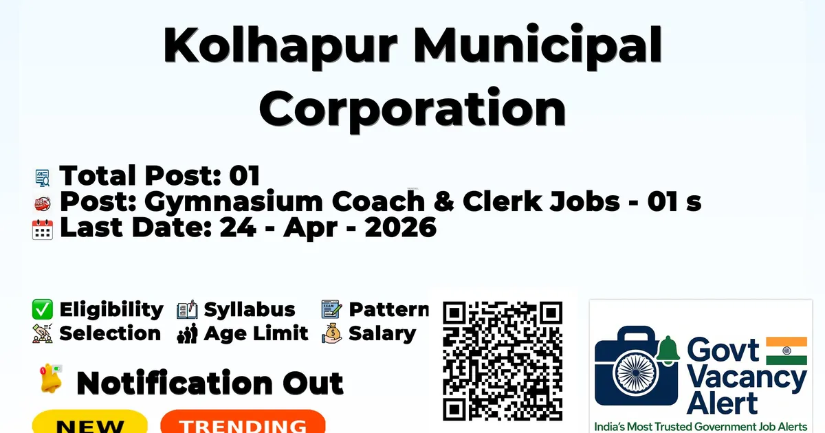 The Kolhapur Municipal Corporation (KMC) has officially released the notification to fill the vacancies of 01 Gymnasium Coach & Clerk Jobs. Interested and eligibile candidates can use this opportunity to apply for these posts before the last date of application. Candidates who have completed their Any Degree can apply for the Kolhapur Municipal Corporation Jobs 2026. The interested applicants can apply in offline mode. Here we have mentioned the education details, age limit, selection process, application fee, salary, and how to apply for these posts before the deadline. The application dates have already begun.