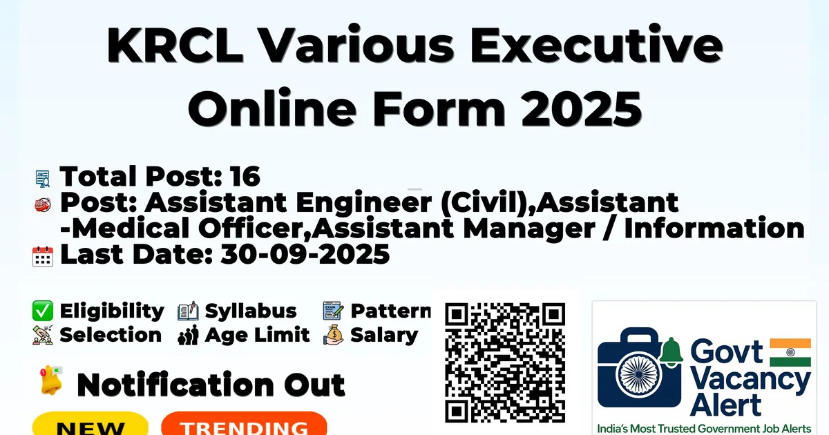 KRCL Various Executive Online Form 2025 — Assistant Engineer (Civil),Assistant Medical Officer,Assistant Manager / Information Technology,Assistant Traffic Manager (Operating & Commercial),Assistant Materials Manager,Assistant Mechanical Engineer,Assistant Signal & Telecom Engineer,Assistant Financial Advisor,Assistant Electrical Engineer,Assistant Personnel Officer,Assistant Deputy General Manager