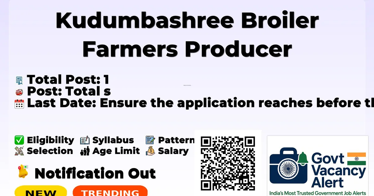 Company Name Kudumbashree Broiler Farmers Producer Company Post Name Plant Manager No of Posts 1 Advt No 023/HR/2022/KBFPCL Salary Rs 50,000 per month Qualification MVSc Graduate or BVSc Graduate with experience Age Limit Below 35 years as on 01.02.2026 Last Date 09-03-2026 Apply Mode Offline Job Type Contract