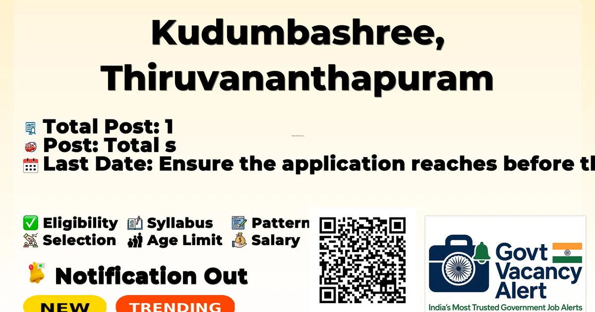 Kudumbashree has released an official notification for the recruitment of 01 District Level Resource Person Posts. Interested and eligible candidates can apply Offline through the official Kudumbashree website. The last date to submit the application form is 20-02-2026. In this article, you’ll find the Kudumbashree District Level Resource Person Posts recruitment details, including eligibility criteria, age limit, salary structure, selection process, application steps, and direct links to the official notification and Offline application form. Advertisement Company Name Kudumbashree, Thiruvananthapuram District Mission Post Name FNHW District Level Resource Person No of Posts 1 Advt No KSTVM/218/2024-E3 Salary Daily travel allowance and honorarium Rs. 750/-; Maximum monthly honorarium Rs. 12,000/- Qualification Degree holder Notification Date 13-02-2026 Last Date 20-02-2026 Apply Mode Offline Job Type Contract Trending Govt Jobs India Post GDS Online Form 2026 RRB 22000 Group D Online form 2026 RBI 650 Assistant Online Form 2026 Aadhaar Operator Supervisor Online Form 2026 Indian Army Agniveer Recruitment Rally Notification 2026 Candidates should download and read the Kudumbashree Jobs 2026 notification PDF carefully to check vacancy details, eligibility, age limit, and application instructions. The notification also includes important dates and selection process details. The direct download link is available in the Important Links section below. Download Kudumbashree Jobs 2026 Notification PDF - Click here Post Name Total Posts FNHW District Level Resource Person 1 Total 1 Qualification: Degree holder Experience: Prior experience as RP at FNHW CDSS level preferred Daily travel allowance: Rs. 750/- Maximum monthly honorarium: Rs. 12,000/- Event Date Last date for receiving applications 20 February 2026 Interview Candidates who wish to apply for Kudumbashree FNHW District Level Resource Person Recruitment 2026 through offline mode should follow the steps below. Read the official notification carefully before applying. Download the application form from the official website. Fill the application form carefully with correct information. Attach self-attested copies of required documents such as photograph, signature, ID proof, and certificates. Check all details carefully before submission. Send the completed application form to the address mentioned in the notification through Speed Post / Registered Post or as instructed. Ensure the application reaches before the last date: 20-02-2026. Keep a photocopy of the submitted application form for future reference. Official Notification PDF: Click here Official Website: Click here Join Arattai Channel: Click Here Join Telegram Channel: Click Here Join WhatsApp Channel: Click Here Sarkari Result: Click Here Download Mobile App: Click Here