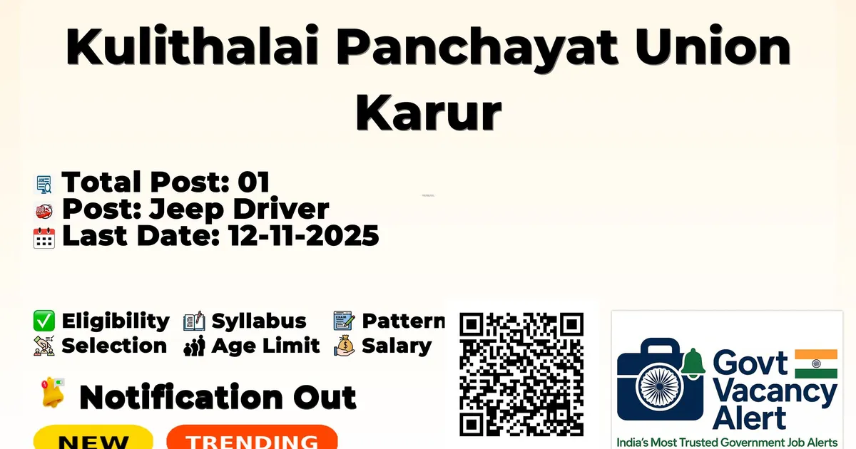Kulithalai Panchayat Union Karur has released an official notification for the recruitment of 01 Jeep Driver Posts. Interested and eligible candidates can apply Offline through the official Kulithalai Panchayat Union Karur website. The last date to submit the application form is 12-11-2025. In this article, you’ll find the Kulithalai Panchayat Union Karur Jeep Driver Posts recruitment details, including eligibility criteria, age limit, salary structure, selection process, application steps, and direct links to the official notification and Offline application form.