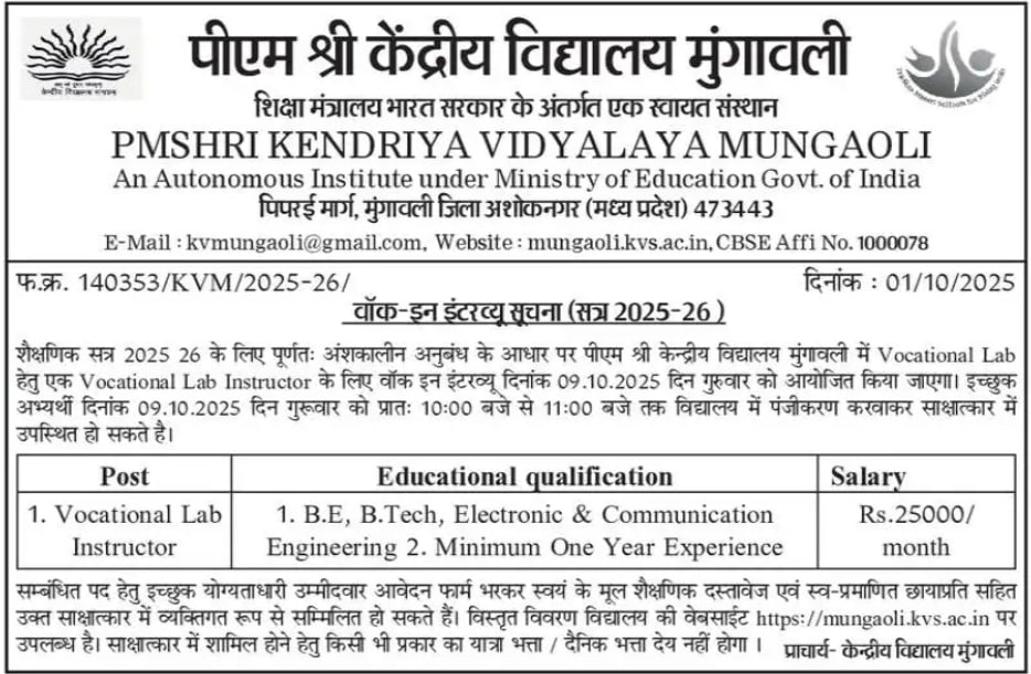 Dear friends, PM SHRI Kendriya Vidyalaya, Mungaoli, District Ashoknagar has released KVS Ashok Nagar Recruitment 2025. All the candidates who like government job can see the PDF of KVS Ashok Nagar Notification 2025. Eligible and interested candidates can apply for this job before the last date. Candidates read this article till the end to get the dates, qualifications, age limit, fees, application and other information of Kendriya Vidyalaya Ashok Nagar Recruitment Form 2025.
