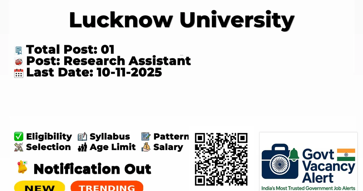 Lucknow University has released an official notification for the recruitment of 01 Research Assistant Posts. Interested and eligible candidates can apply Offline through the official Lucknow University website. The last date to submit the application form is 10-11-2025. In this article, you’ll find the Lucknow University Research Assistant Posts recruitment details, including eligibility criteria, age limit, salary structure, selection process, application steps, and direct links to the official notification and Offline application form.