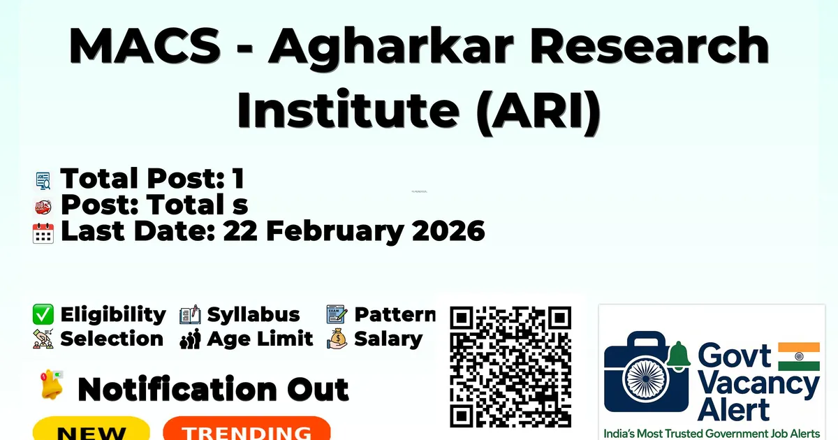 Company Name MACS - Agharkar Research Institute (ARI) Post Name Project Assistant No of Posts 1 Advt No ADVT/RecT/37/SP-376/PA/2025-26 Salary Rs. 20,000/- Per Month + HRA Qualification B.Sc. in Life Sciences Age Limit 50 years Last Date for Apply 22 February 2026 Official Website http://arijob.ourlib.in