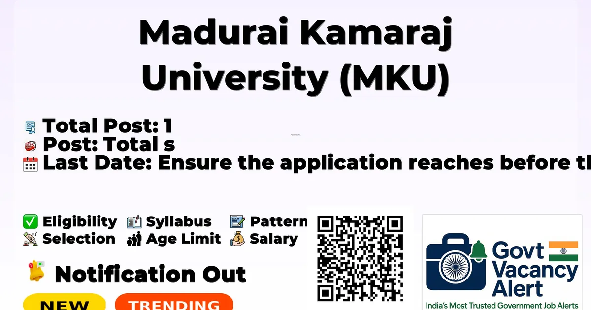 Madurai Kamaraj University (MKU) has officially released a notification for the recruitment of 1 Project Assistant (PA) Posts. This recruitment drive offers a great opportunity for candidates looking for government jobs. Interested and eligible candidates can download the application form from the official website and submit it offline.
