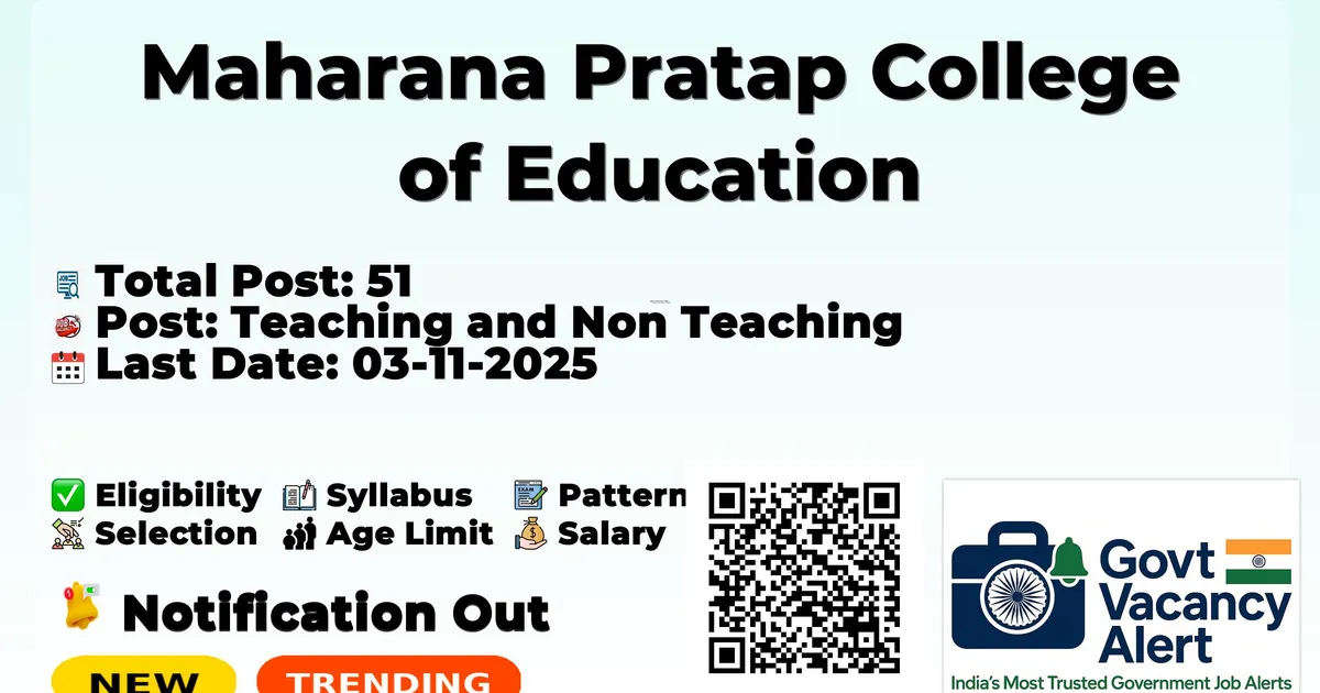 Maharana Pratap College of Education has released an official notification for the recruitment of 51 Teaching and Non Teaching Posts. Interested and eligible candidates can apply Offline through the official Maharana Pratap College of Education website. The last date to submit the application form is 03-11-2025. In this article, you’ll find the Maharana Pratap College of Education Teaching and Non Teaching Posts recruitment details, including eligibility criteria, age limit, salary structure, selection process, application steps, and direct links to the official notification and Offline application form.