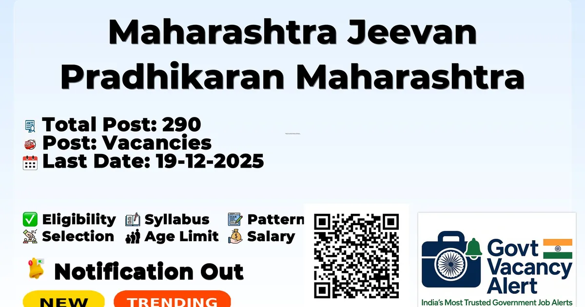 Maharashtra Jeevan Pradhikaran Maharashtra (MJP Maharashtra) has released an official notification for the recruitment of 290 Junior Engineer, Clerk and Other Posts. Interested and eligible candidates can apply Online through the official MJP Maharashtra website. The last date to submit the application form is 19-12-2025. In this article, you’ll find the MJP Maharashtra Junior Engineer, Clerk and Other Posts recruitment details, including eligibility criteria, age limit, salary structure, selection process, application steps, and direct links to the official notification and Online application form.