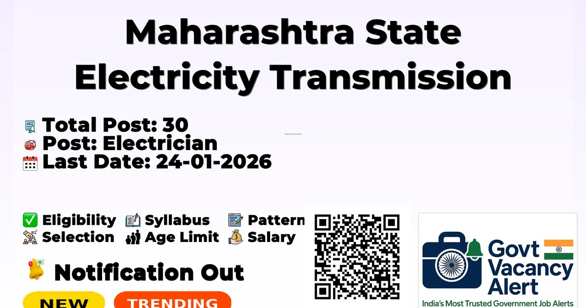 Company Name Maharashtra State Electricity Transmission Company (MAHATRANSCO) Post Name Electrician No of Posts 30 Qualification 10TH Age Limit 18 to 38 years Start Date for Apply Online 17-01-2026 Last Date for Apply Online 24-01-2026 Official Website mahatransco.in