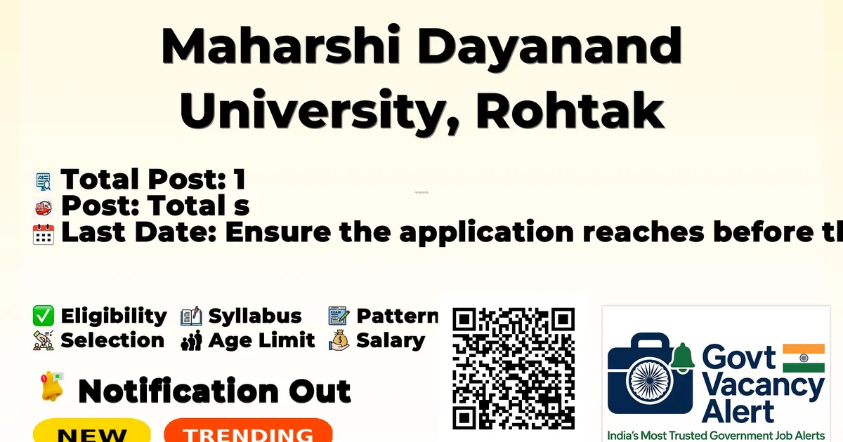 Maharshi Dayanand University, Rohtak (MDU Rohtak) has released an official notification for the recruitment of 1 Research Assistant Posts. Interested and eligible candidates can apply Offline by sending the application form to the official address. The last date to submit the application is 16-03-2026.