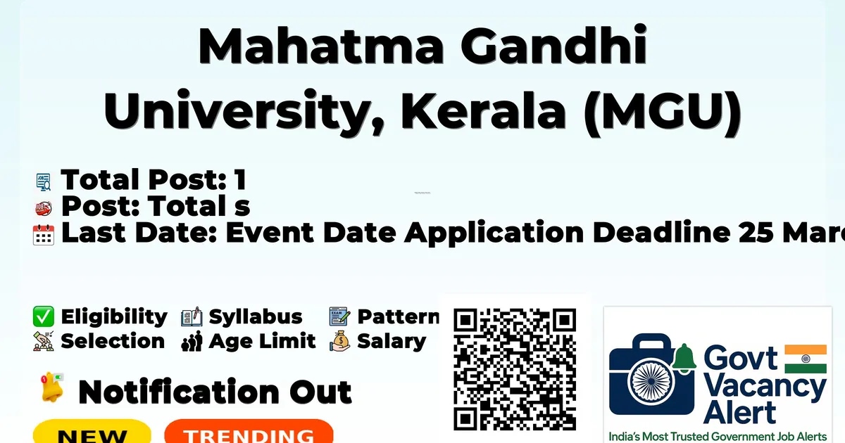 Mahatma Gandhi University, Kerala (MGU) has released an official notification for the recruitment of 1 Co-Ordinator Posts. Interested and eligible candidates can apply Offline by sending the application form to the official address. The last date to submit the application is 25-03-2026. In this article, you'll find the Co-Ordinator recruitment details, including eligibility criteria, age limit, salary structure, selection process, application procedure, and direct links to the official notification and application form download. Advertisement Company Name Mahatma Gandhi University, Kerala (MGU) Post Name Co-Ordinator No of Posts 1 Advt No 57026/AD A5-3/2020/AD A 5 Salary Rs. 30,000/- per month Qualification Eminent scholar with Ph.D in Food Science and Nutrition/relevant discipline, actively engaged in research with a minimum of 10 publications in national/international journals with high impact factor. Minimum of 15 years of teaching experience in University/college and/or experience in research at the University/National level institutions/industries, including experience in guiding students for research at doctoral level. Contribution to educational innovations, designing new curriculum and courses, and experience in technology mediated teaching-learning processes. Age Limit Below 60 years as on 01.01.2026 Last Date 25-03-2026 Apply Mode Offline Job Type Contract Candidates should download and read the MGU Jobs 2026 notification PDF carefully to check vacancy details, eligibility, age limit, and application instructions. The notification also includes important dates and selection process details. The direct download link is available in the Important Links section below. Download MGU Co-Ordinator Job 2026 Notification PDF Post Name Total Posts Co-Ordinator 1 Total 1 Trending Govt Jobs IDBI Bank Junior Assistant Manager Online Form 2026 RRC Western Railway 5349 Apprentice Online Form 2026 Indian Navy Agniveer (MR) Online Form 2026 UPSC 1358 CMS Online Form 2026 Indian Navy Agniveer (SSR) Online Form 2026 Co-Ordinator: Ph.D in Food Science and Nutrition/relevant discipline, Minimum of 10 publications in national/international journals with high impact factor, Minimum of 15 years of teaching experience in University/college and/or experience in research at the University/National level institutions/industries, including experience in guiding students for research at doctoral level, Contribution to educational innovations, designing new curriculum and courses, and experience in technology mediated teaching-learning processes. No application fee is mentioned in the official notification. The maximum age limit for the Co-Ordinator post is 60 years as on 01.01.2026. Age relaxation will be as per the rules. Co-Ordinator: Rs. 30,000/- per month Event Date Application Deadline 25 March 2026 Last Date to Apply 25 March 2026 Interview Read the official notification carefully before applying. Download the application form from the official website: . Fill the application form carefully with correct information. Attach self-attested copies of required documents such as photograph, signature, ID proof, and certificates. Check all details carefully before submission. Send the completed application form to the address mentioned in the notification through Speed Post / Registered Post or as instructed. Ensure the application reaches before the last date: 25-03-2026. Keep a photocopy of the submitted application form for future reference. Link Description Link Official Notification PDF Click here Apply Offline Click here Official Website Click here